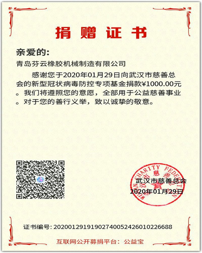青島芬云橡膠機械制造有限公司為祖國抗擊疫情而努力